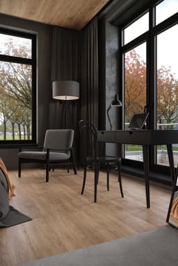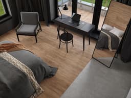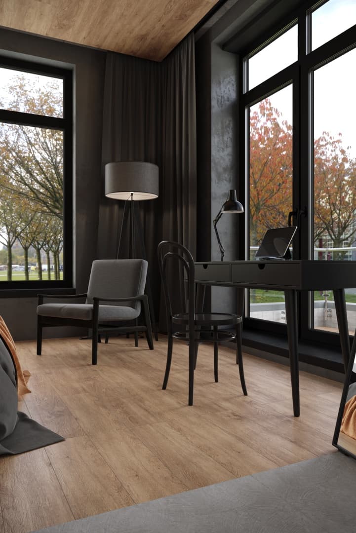 Напольное покрытие «Гевуина» имеет древесную текстуру с видимыми годичными кольцами и разводами. Цвет варьируется от светло-коричневого до темно-коричневого, создавая игру оттенков и фактур. Эффект сероватой дымки добавляет глубины и утонченности покрытию, что способствует спокойной и размеренной атмосфере в помещении. Оттенок подчеркивает свежесть и благородство натуральных древесных материалов.