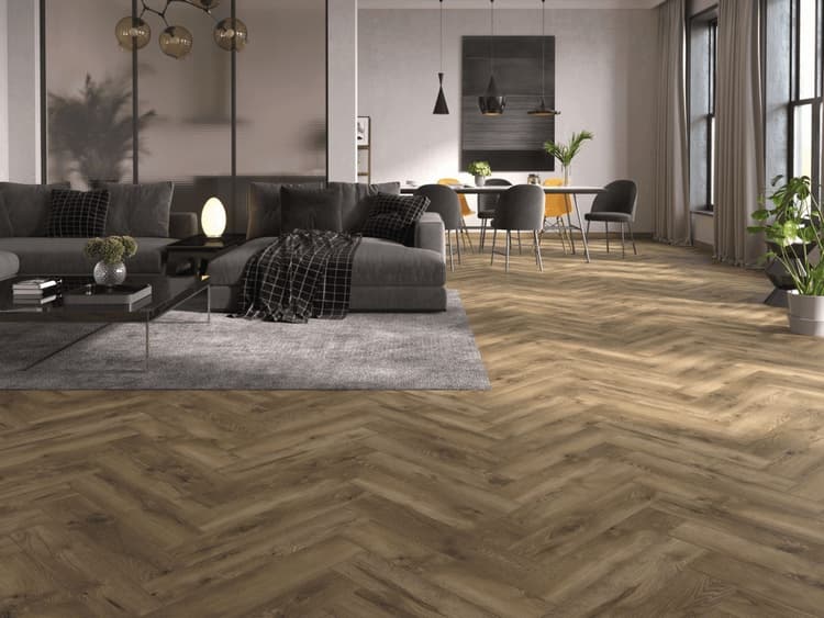 Новая коллекция ламината VILLE – это трендовые декоры в сочетании с непревзойденной элегантностью укладки «английская елка» и с аутентичной текстурой матового дерева. Этот вид укладки придает полу классический и элегантный вид, а также позволяет создать неповторимый интерьер в любом помещении.